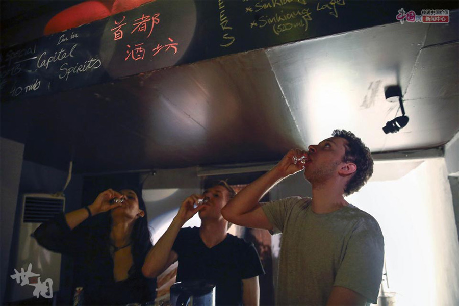 Three foreigners drink the snake medicinal liquor.(china.org.cn/ Zhang Hao)