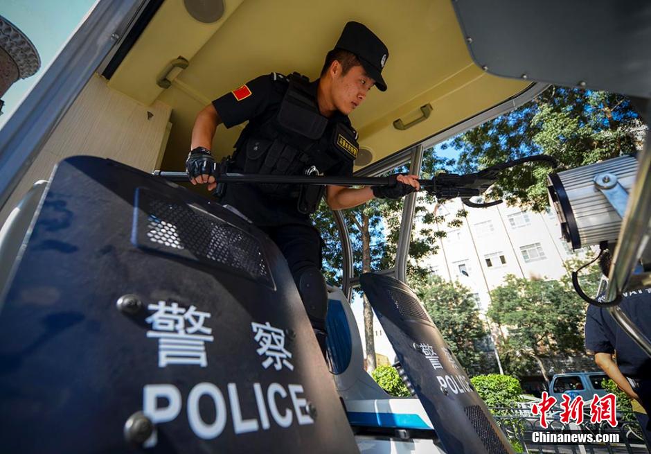 | A new type of anti-terrorism electric patrol car is seen on street in Urumqi, capital of northwest China's Xinjiang Uygur Autonomous Region on Aug. 28, 2014. The electric-powered car is installed with advanced equipment such as police searchlight and real-time monitoring device. (Photo/ Liu Xin) |