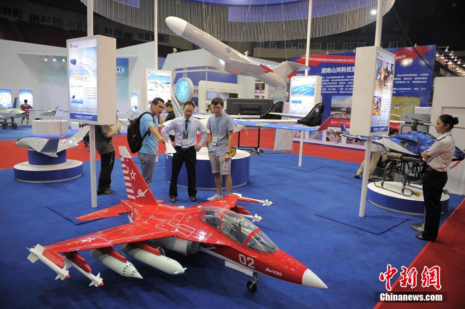 2014 International drones and model aircraft technology and equipment exhibition kicks off in north China's Tianjin on Aug. 29, 2014. More than 70 enterprises from home and abroad specializing in drone research and manufacture participate in the exhibition with advanced products including GPS, telecommunication products etc. This exhibition aims to establish an all-around communication platform and to promote integrated military and civilian development. (CNS/Tong Yu)
