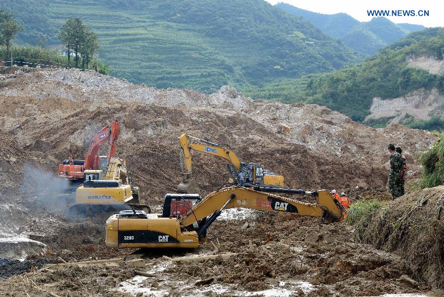 | Excavators work at the site where a landslide occurred in Yingping Village, Fuquan City of southwest China's Guizhou Province, Aug. 31, 2014. Rescuers combing the rubble at the landslide site here retrieved two more bodies Sunday morning, bringing the total death toll in the disaster to 22, rescue authorities said. Twenty-two others have been injured and one has remained missing as of 10 a.m., four days after a 600-meter-high knoll broke free and swept into the village. (Xinhua/Wu Rubo) |