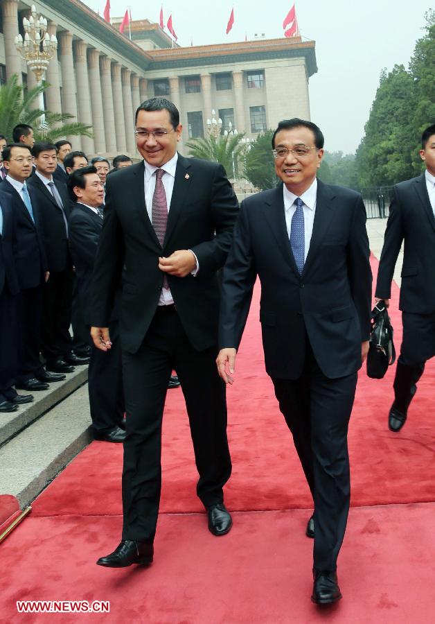Chinese Premier Li Keqiang (R, front) holds a welcoming ceremony for Romanian Prime Minister Victor Ponta before their talks in Beijing, capital of China, Sept. 1, 2014. (Xinhua/Liu Weibing)