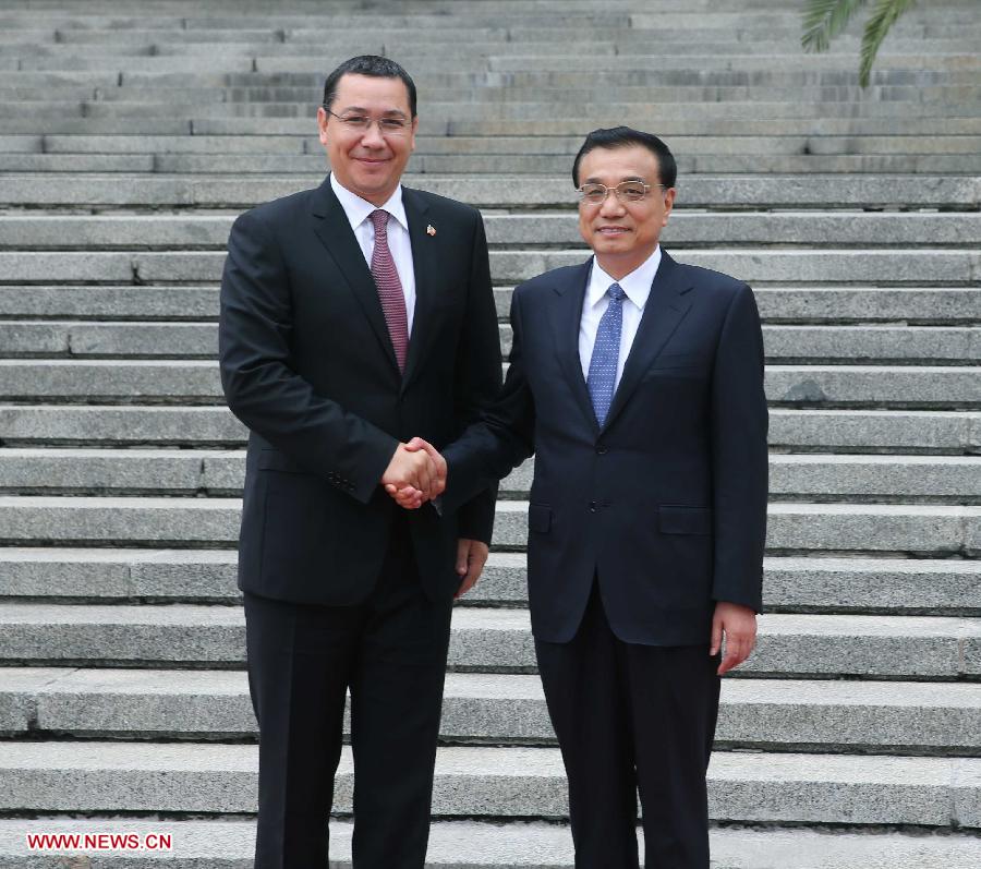 Chinese Premier Li Keqiang (R) holds a welcoming ceremony for Romanian Prime Minister Victor Ponta before their talks in Beijing, capital of China, Sept. 1, 2014. (Xinhua/Liu Weibing)