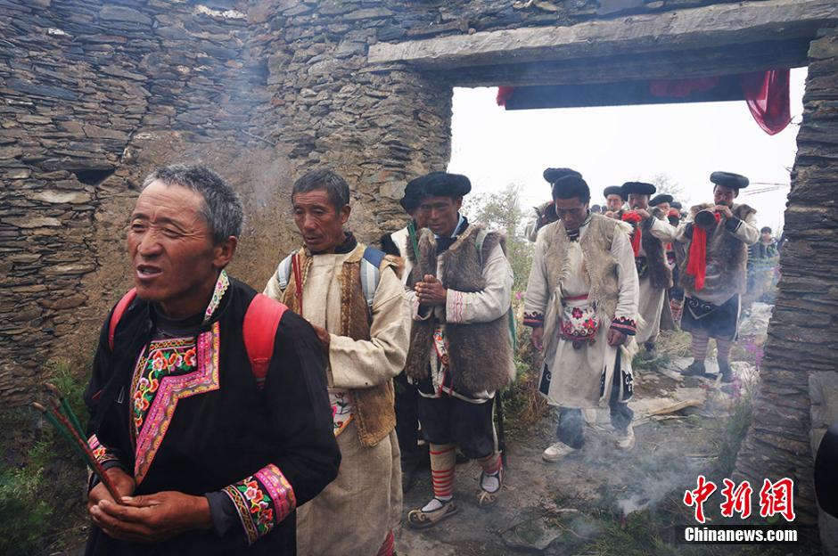 Qiang people offer sacrifices to their God "Baihaha" every year on August 8 of the lunar calendar at Baikong Temple in southwest China's Sichuan province. The temple is the only place in Qiang region where natural white rocks are worshipped. White rocks mean happiness, prosperity and gratitude in the eyes of Qiang. (CNS/Zhang Zixuan)