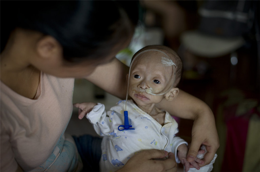Yuanyuan lies in his mother arms most of the time. She will cry once her mother puts her down. Her mother constantly rubs Yuanyuan’s big stomach to help her digestion. A pipe is plugged into Yuanyuan’s nose through which food are sent into her stomach. (Photo/Haiwainet.cn)