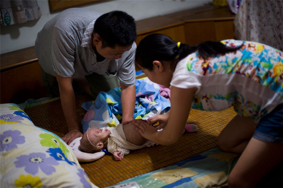 Wu Lunjiao, Yuanyuan’s mother, says that Yuanyuan weighed 2.85 kilograms and was 50 centimeters high at birth. The baby now is only 10 centimeters higher and 0.5 kilograms heavier. Yuanyuan has been troubled in eating since birth so that it takes 2 hours for her to drink 30 ml milk. (Photo/Haiwainet.cn)