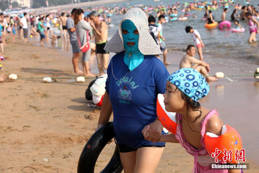 A 'facekini' dama goes on shore with her granddaughter, July 12, 2013. (China News Service/Xu Chongde)
