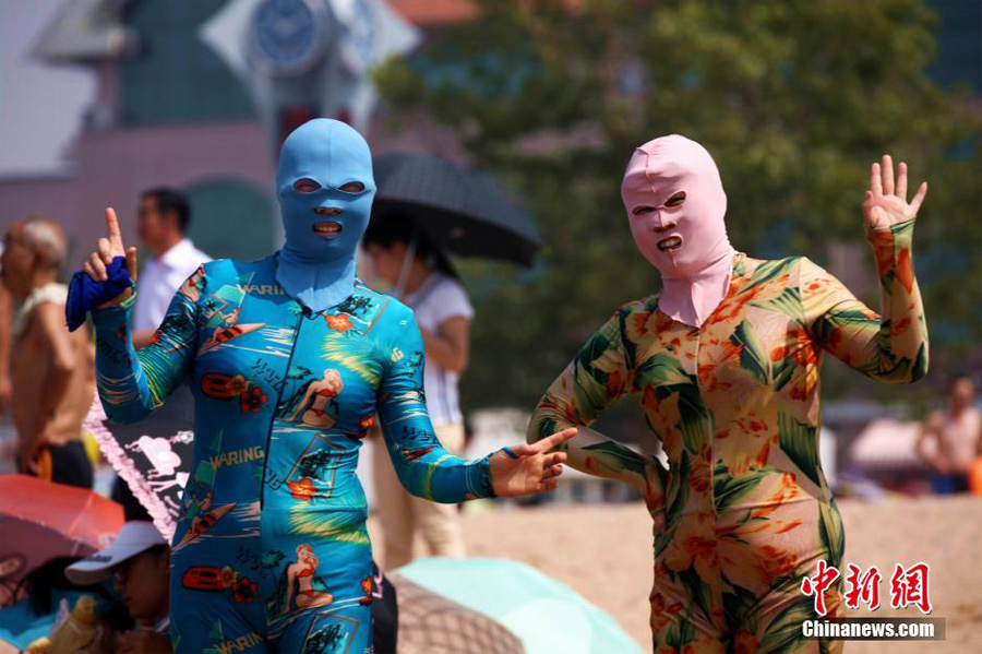Two 'facekini' damas take photo before go to swim in the sea, Aug. 8, 2013. (China News Service/Xu Chongde)