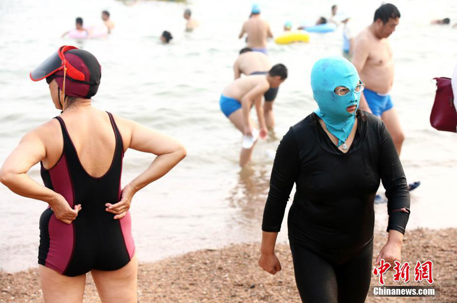 A 'facekini' dama goes on shore, July 20, 2010. (China News Service/Xu Chongde)