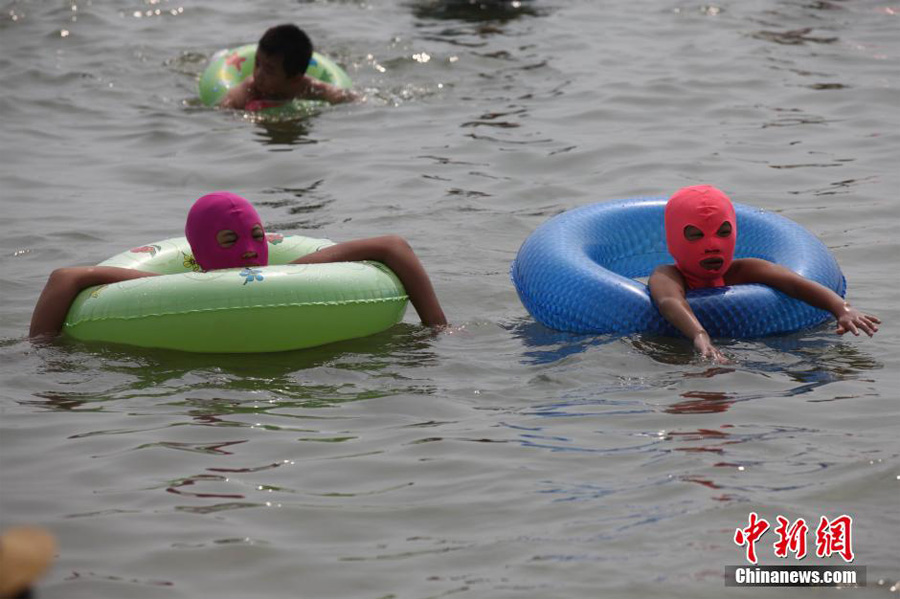 Two 'facekini'kids learn to swim in swim rings, Aug. 19, 2012. (China News Service/Xu Chongde)