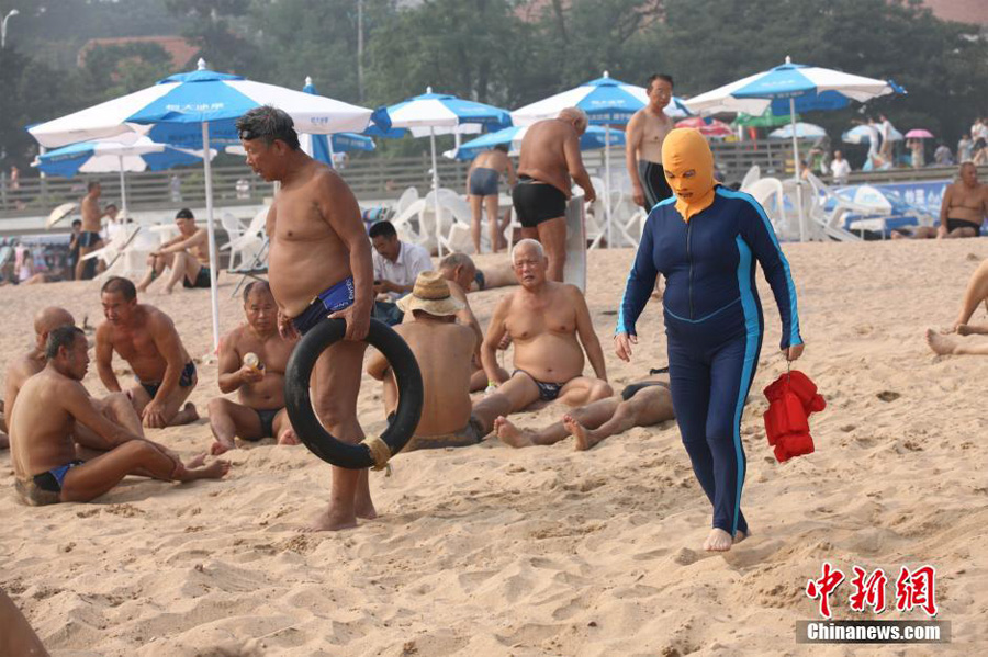 A 'facekini' dama walks on the beach, July 20, 2010. (China News Service/Xu Chongde)