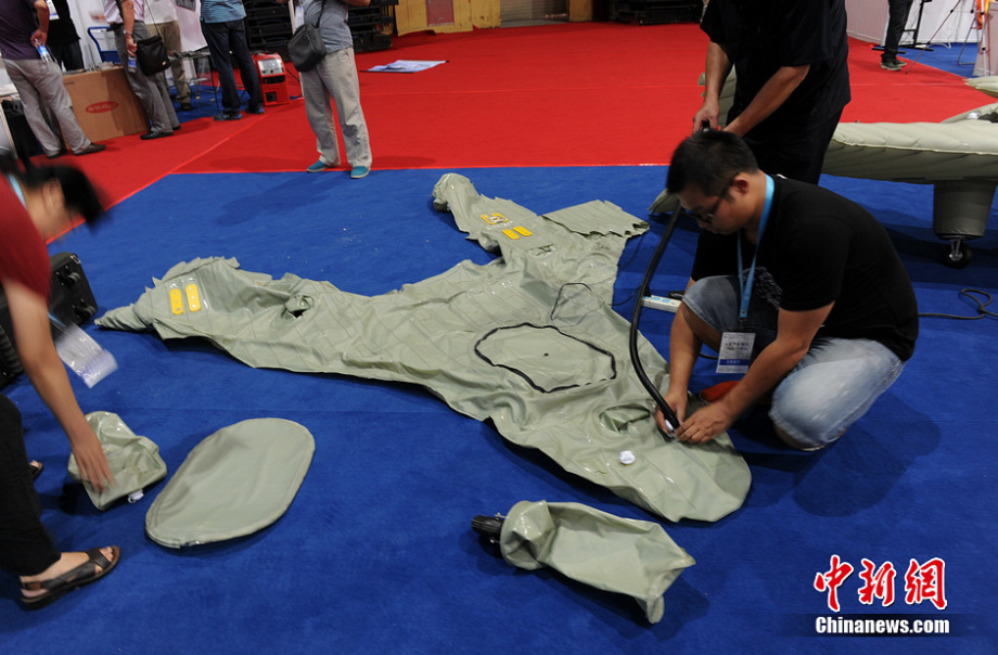 An inflatable aircraft meets the public at Tianjin International UAV Exhibition on Aug. 29 2014. Inflatable aircraft is the aircraft without rigid skeleton. Comparing with normal aircraft, it has big load capacity, good flexibility and high impact resistance. It can be used for low speed and low altitude navigation, aerial survey and remote sensing. (CNS/Chen Haifeng)