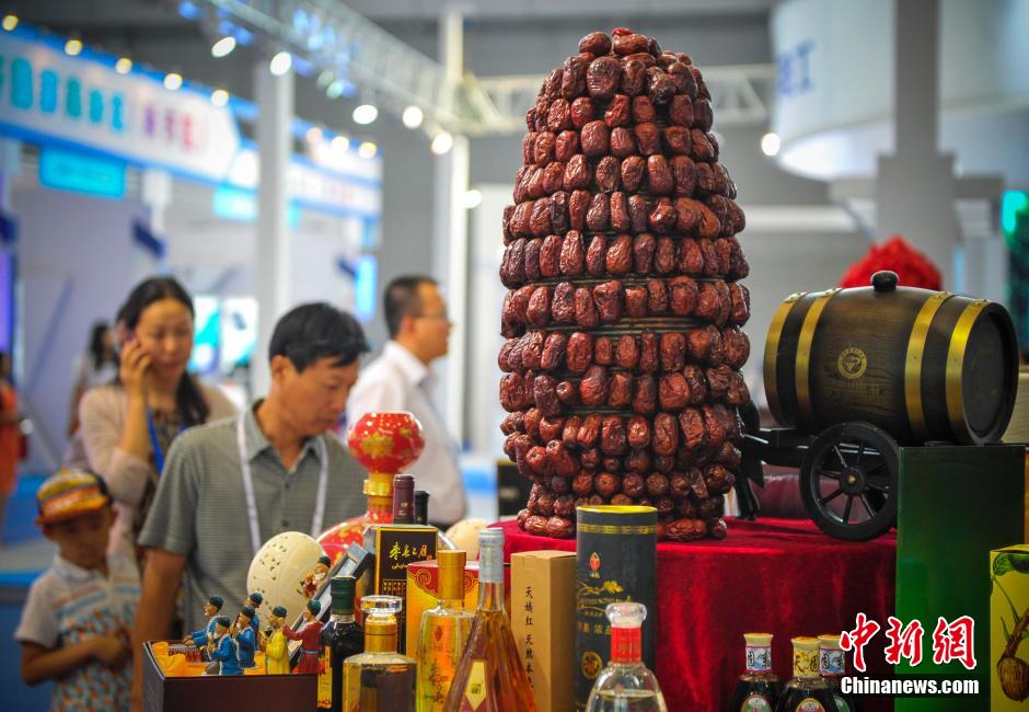 A pagoda made of jujubes in the exhibition area of Xinjiang, Sept. 2, 2014. (Chinanews/Liu Xin)