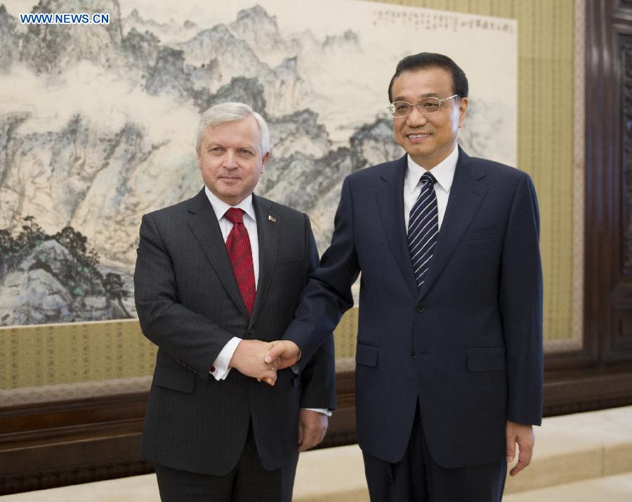 Chinese Premier Li Keqiang (R) meets with Deputy Prime Minister of Belarus Anatoliy Tozik in Beijing, China, Sept. 4, 2014. Tozik is here for the first meeting of the intergovernmental committee of cooperation between the two countries. (Xinhua/Xie Huanchi)