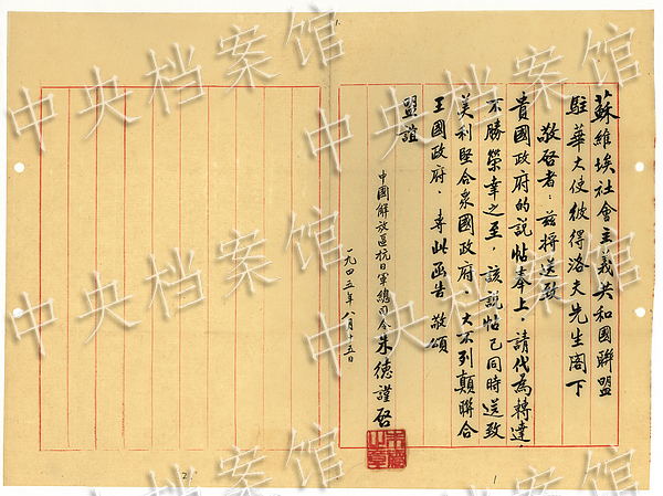 On August 15, 1945, Zhu De asked the ambassador of the Soviet Union to China to deliver the letter to the government of the Soviet Union. (Photo/China's State Archives Administration)
