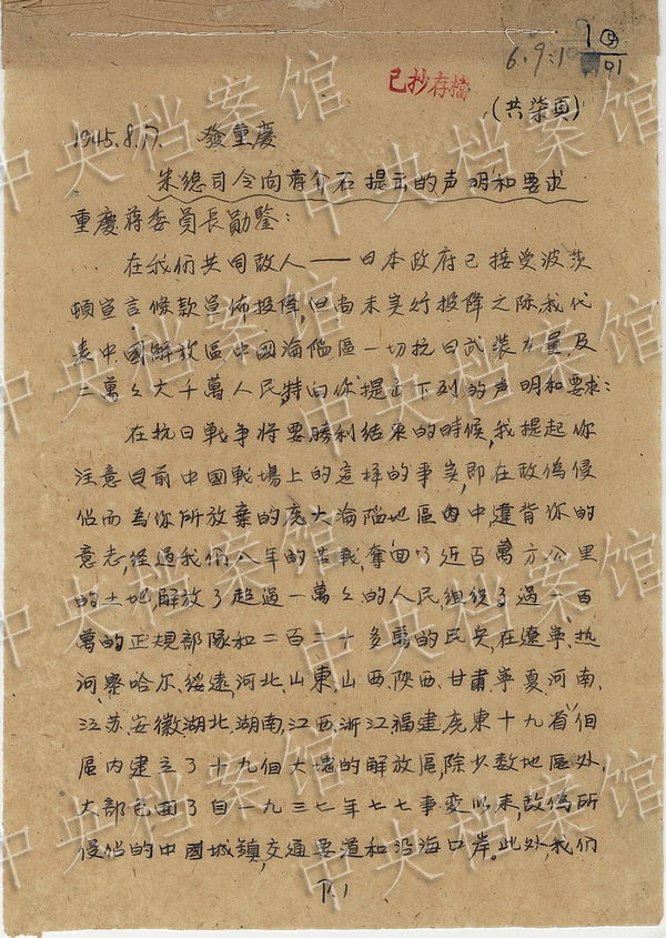 On August 16, Zhu De put forward requests to Chiang Kai-shek. (Photo/China's State Archives Administration)