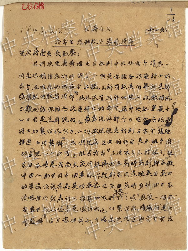 On August 13, 1945, Zhu De and Peng Dehuai refused the order from Chiang Kai-shek. (Photo/China's State Archives Administration)