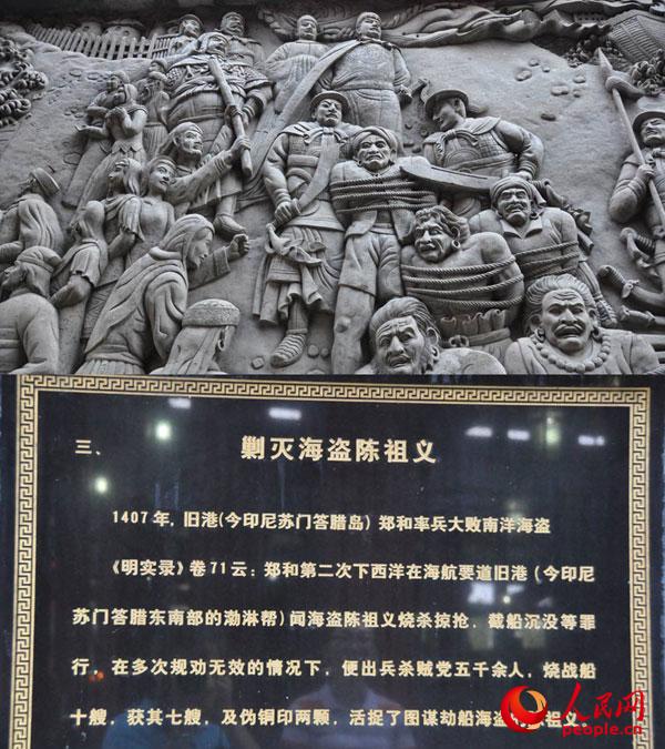 Frescoes recording treasure voyages stand behind the main temple in Sam Po Kong. (People's Daily Online/Shan Chengbiao)