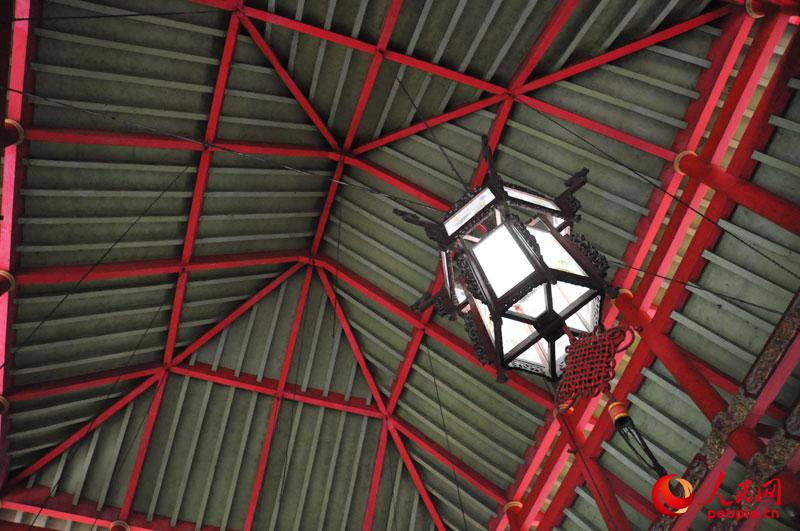 The red geometric ceiling of the main temple is full of Chinese elements. (People's Daily Online/Shan Chengbiao)