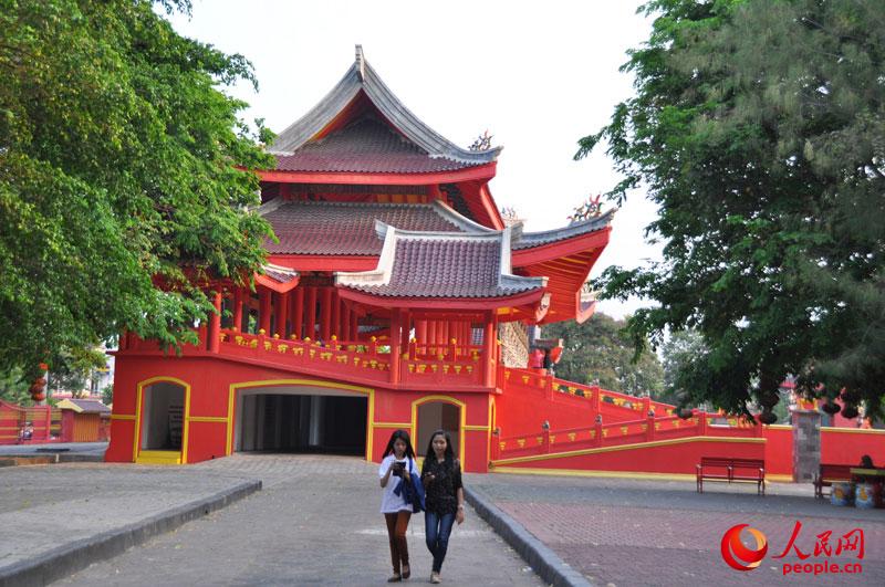 1.A big palace of Ming style with red tiles and white walls is at the entrance of Sam Po Kong. (People's Daily Online/Li Haixia)