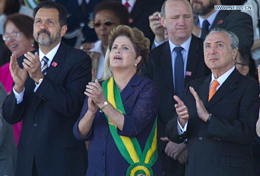 Brazilian President Dilma Rousseff (C), and the Governor of Brasilia's Federal District, Agnelo Queiroz (L) take part in a military parade to commemorate the Independence's Day of Brazil, in Brasilia, Brazil, on Sept. 7, 2014. Brazil celebrates the 192th anniversary of its independence on Sunday. (Xinhua/Ed Ferreira/AGENCIA ESTADO)