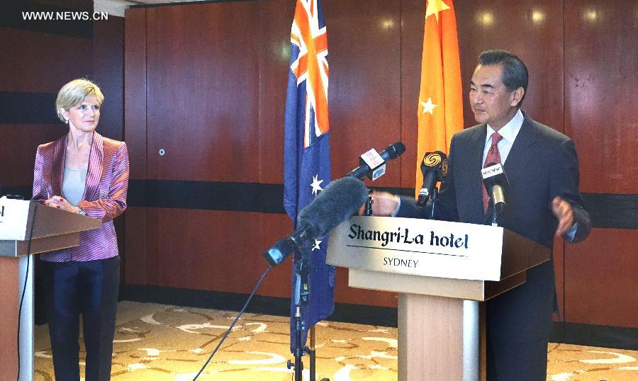 Chinese Foreign Minister Wang Yi (R) and his Australian Counterpart Julie Bishop attend a news conference before the second China-Australia diplomatic and strategic dialogue in Sydney, Australia, Sept. 7, 2014. (Xinhua/Jin Linpeng)