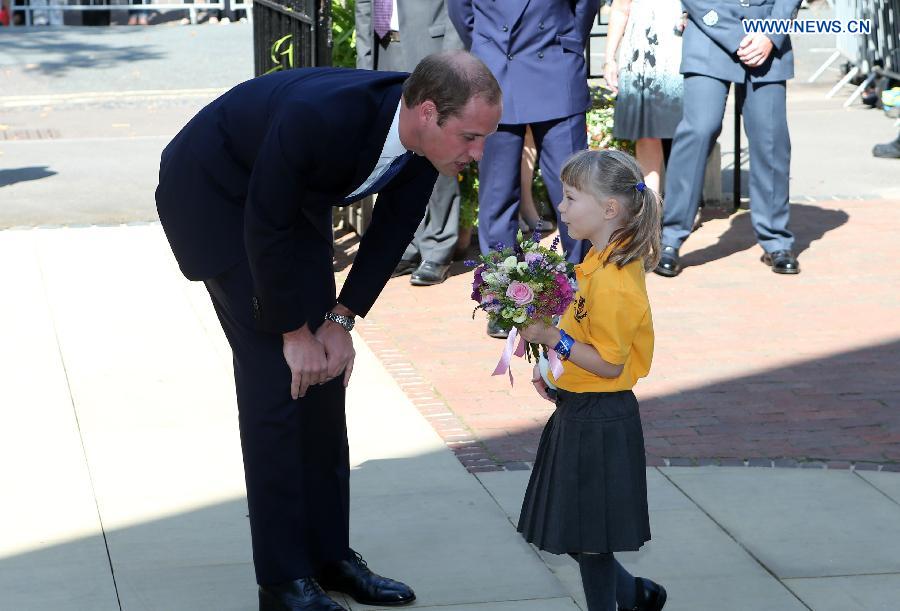 Prince William (L), Duke of Cambridge, receives flowers as he arrives to formally inaugurate the Dickson Poon University of Oxford China Centre Building in Oxford, the United Kingdom, on Sept. 8, 2014. Prince William unveiled the Dickson Poon University of Oxford China Centre here on Monday. (Xinhua/Han Yan)