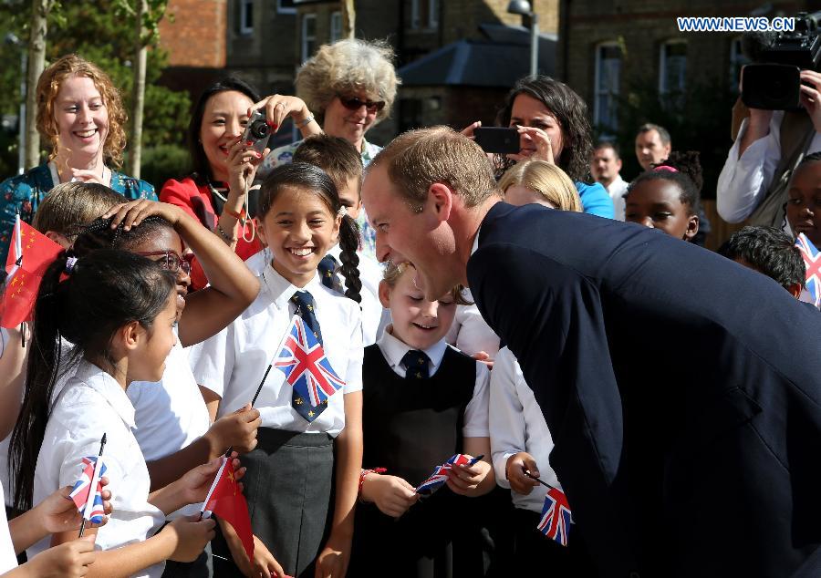 Prince William (R), Duke of Cambridge, speaks to school students as he arrives to formally inaugurate the Dickson Poon University of Oxford China Centre Building in Oxford, the United Kingdom, on Sept. 8, 2014. Prince William unveiled the Dickson Poon University of Oxford China Centre here on Monday. (Xinhua/Han Yan)