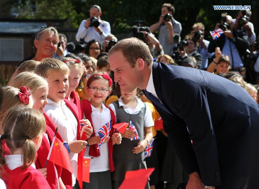 Prince William (R), Duke of Cambridge, speaks to school students as he arrives to formally inaugurate the Dickson Poon University of Oxford China Centre Building in Oxford, the United Kingdom, on Sept. 8, 2014. Prince William unveiled the Dickson Poon University of Oxford China Centre here on Monday. (Xinhua/Han Yan)