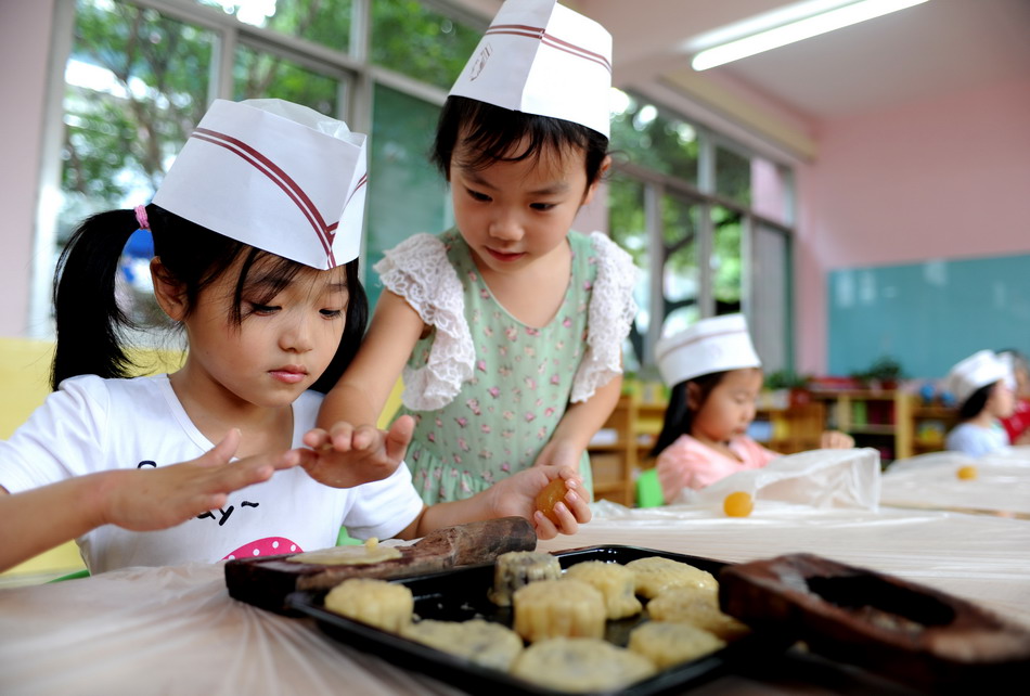 Two children make moon cakes with traditional molds. (Xinhua/Liu Junxi)