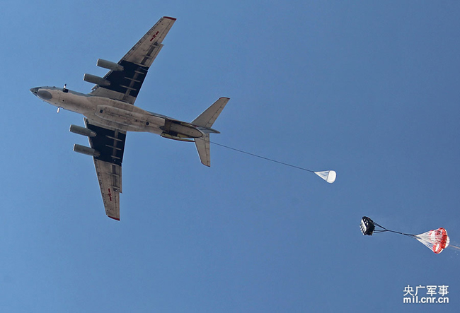 Chinese transport aircraft launches airborne fighting vehicle to the battleground in Peace Mission 2014, a joint anti-terror military drill conducted by forces of the Shanghai Cooperation Organization (SCO) countries. (Photo/mil.cnr.cn)