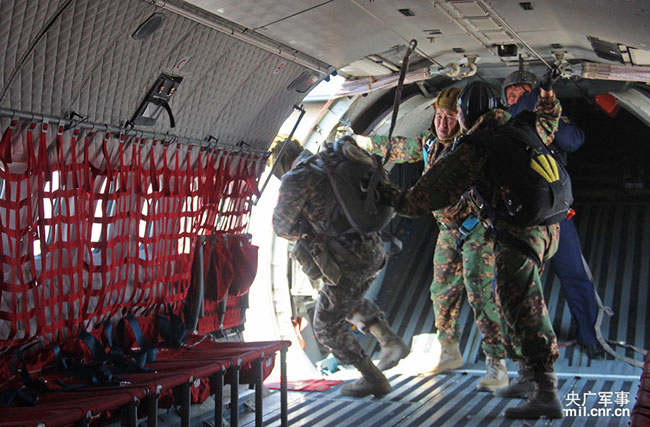 Kazakhstan airborne combatants jump off the aircraft to join the ground battle in Peace Mission 2014, a joint anti-terror military drill conducted by forces of the Shanghai Cooperation Organization (SCO) countries. (Photo/mil.cnr.cn)