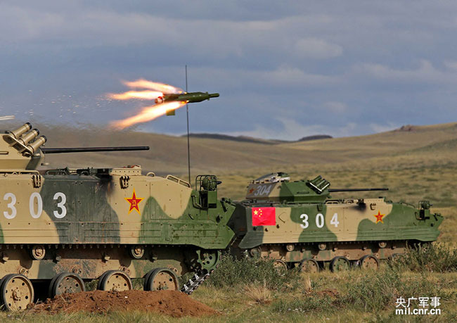 Chinese airborne fighting vehicle launch missiles against terrorists in Peace Mission 2014, a joint anti-terror military drill conducted by forces of the Shanghai Cooperation Organization (SCO) countries. (Photo/mil.cnr.cn)