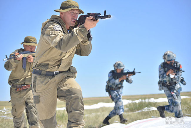Chinese and Kazakhstan airborne combatants land on battleground in Peace Mission 2014, a joint anti-terror military drill conducted by forces of the Shanghai Cooperation Organization (SCO) countries. (Photo/mil.cnr.cn)