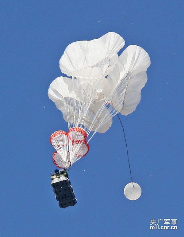 A large Chinese military transport aircraft delivers an airborne fighting vehicle accurately to the frontline of Peace Mission 2014, a joint anti-terror military drill conducted by forces of the Shanghai Cooperation Organization (SCO) countries. (Photo/mil.cnr.cn)