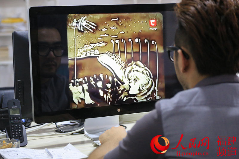 Xiao Gang watches sand paintings videos on the computer. (Photo/people.cn)