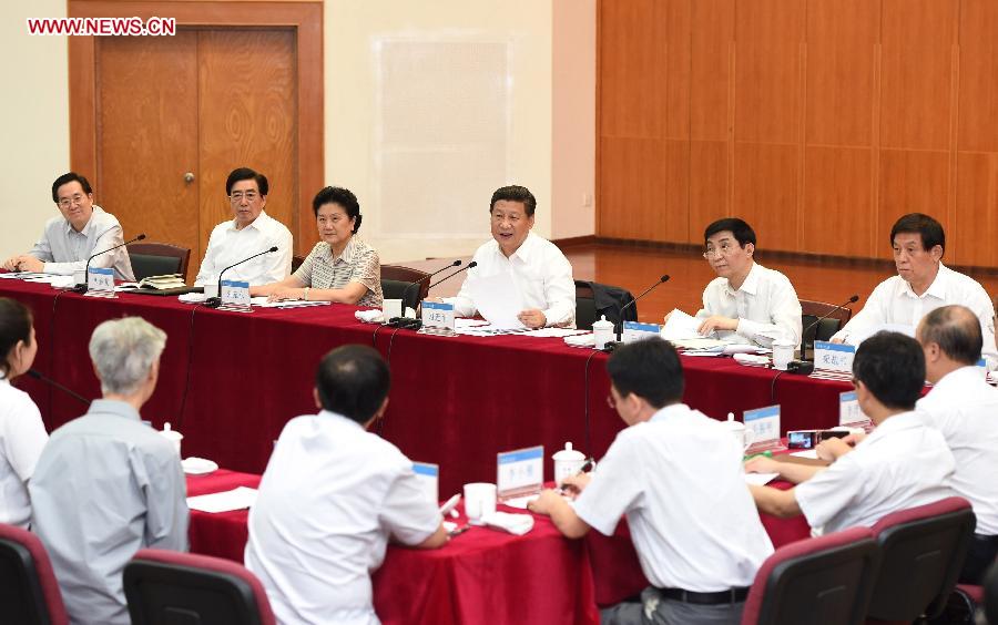Chinese President Xi Jinping holds discussions with teachers and students at Beijing Normal University in Beijing, capital of China, Sept. 9, 2014. Xi made an inspection tour to Beijing Normal University Tuesday, the eve of Teachers' Day in China. (Xinhua/Ma Zhancheng)