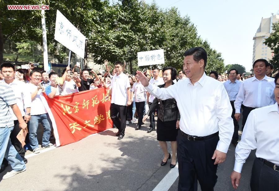 Chinese President Xi Jinping waves to teachers and students at Beijing Normal University in Beijing, capital of China, Sept. 9, 2014. Xi made an inspection tour to Beijing Normal University Tuesday, the eve of Teachers' Day in China. (Xinhua/Ma Zhancheng)