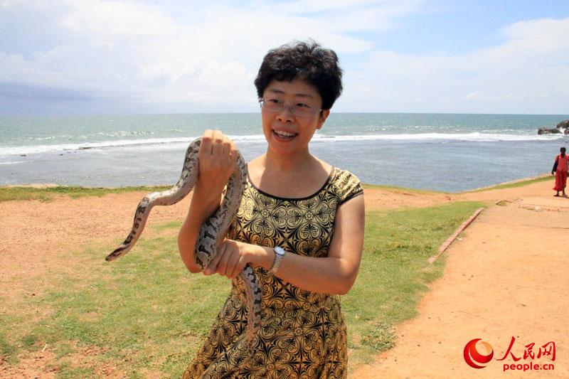 Meng Man takes the snake from the "street artist." (Photo/People's Daily Online)