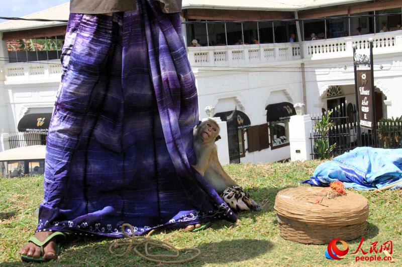 A monkey leans on a "street artist" who raises snakes and monkeys for tourists to take photos. (Photo/People's Daily Online)