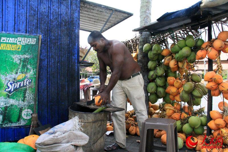 A vendor cuts coconut for sale, one for 50-100 rupee. (Photo/People's Daily Online)