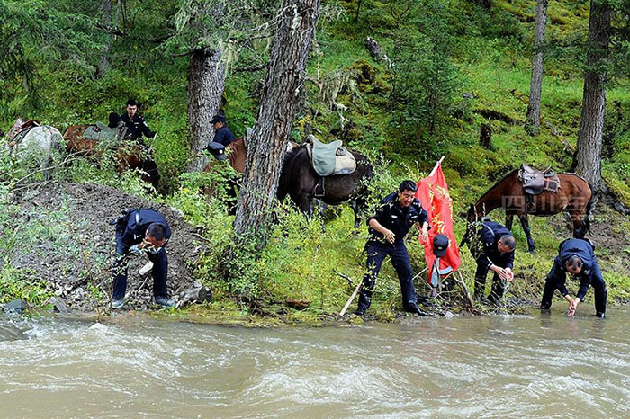 Several policemen wash their faces by the river. (www.scol.com.cn)