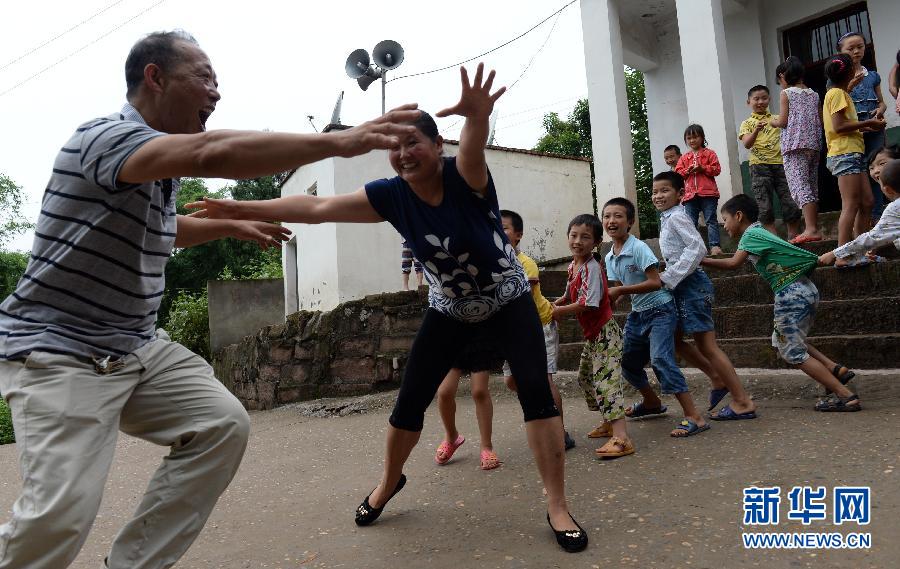 Chen Hongquan (L1) and his wife Ming Hongyan (L2) play games with pupils during the break in a village school in Nanchong, southwest China's Sichuan province on Sept. 9, 2014. (Xinhua/Li Xiangyu)