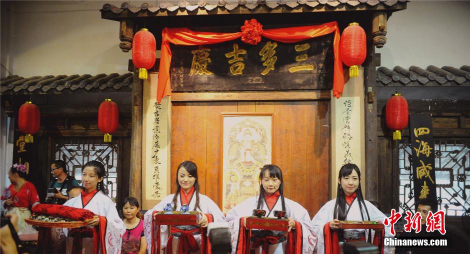 | On Sept. 8, 2014, the Mid-Autumn Day, a young man proposes to his girlfriend in Ciqikou, an ancient town in southwest China’s Chongqing. Both of them love traditional culture and he decided to give his girlfriend a surprise by proposing to her in accordance with etiquette of Zhou Dynasty. (Chinanews.com/Liu Yu) |