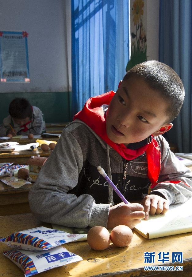 A student does homework in the Tibetan classes at Jiujia Elementary School in Labrang Town of Xiahe county, northwest China's Gansu province on Sept. 2, 2014.(Xinhua News Agency/Zhang Meng)