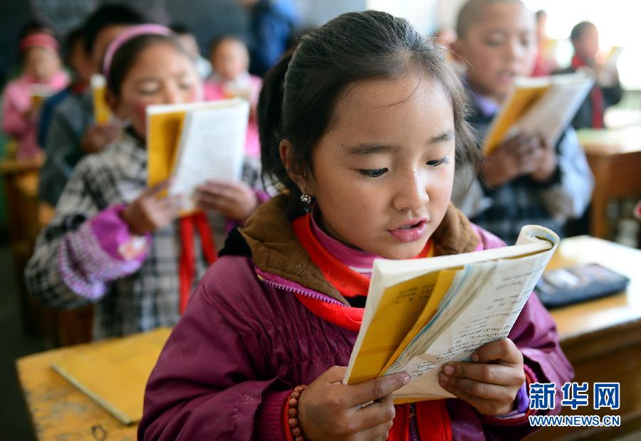 A Tibetan student reads the text in the Tibetan classes at Jiujia Elementary School in Labrang town of Xiahe county, northwest China's Gansu province on Sept. 2, 2014. (Xinhua News Agency/Zhang Meng)