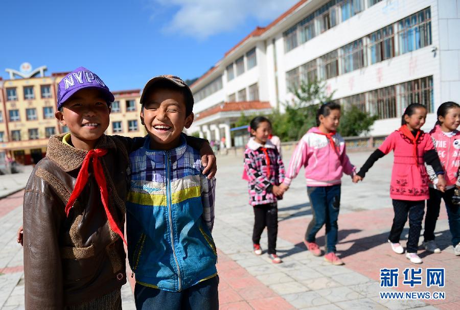 Students play at Jiujia Elementary School in Labrang town of Xiahe county, northwest China's Gansu province, Sept. 2, 2014. Jiujia Elementary School has 627 students; all of them are Tibetan. Teachers give classes in both Tibetan and Han languages. Besides having traditional classes such as mathematics and English, students can select a "dream class," which teaches Tibetan Guozhuang Dance and innovative paintings. (Xinhua News Agency/Li Mangmang)
