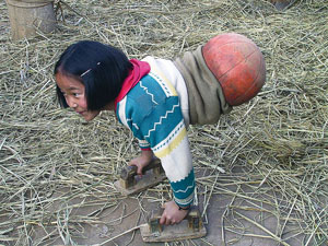 Qian Hongyan 'walks' by hands with two wooden blocks and a basketball is used to cover the bottom of her upper body. (Photo/yunnan.cn)
