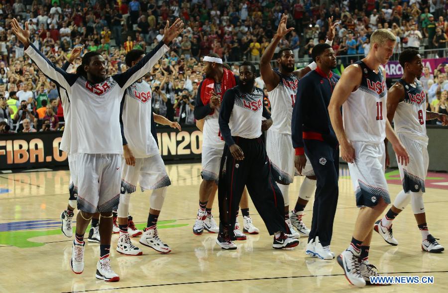 Players of the United States celebrate after the semifinal match with Lithuania at the 2014 FIBA Basketball World Cup Spain in Barcelona Sept. 11, 2014. The United States won 96-68. (Xinhua/Pau Barrena)