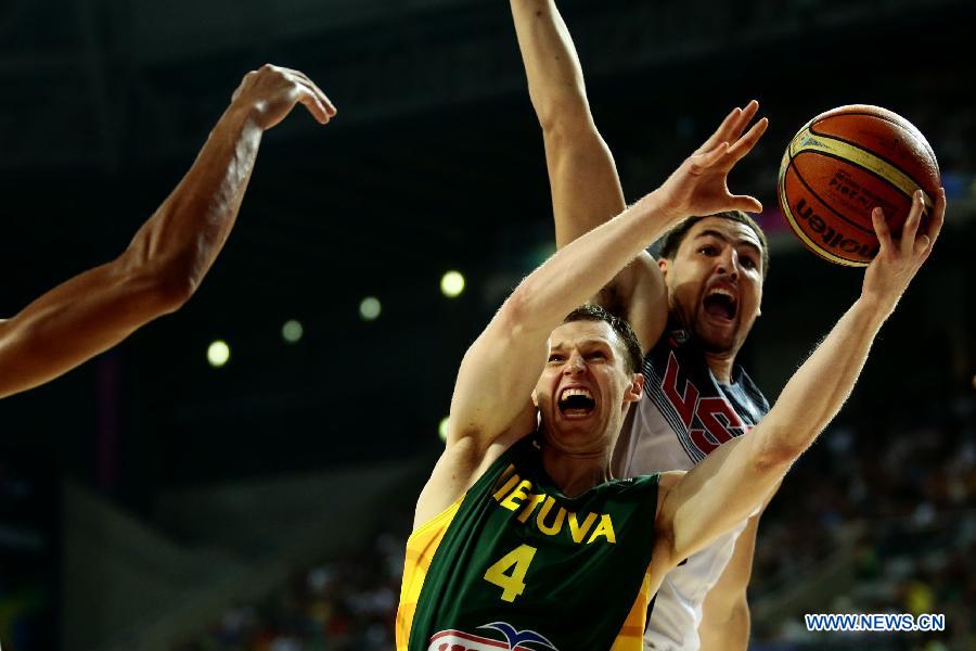 Martynas Pocius (Front) of Lithuania, goes to the basket during the semifinal match of the 2014 FIBA Basketball World Cup Spain, against the United States, in Barcelona, Spain, on Sept. 11, 2014. Lithuania lost 68-96. (Xinhua/Pau Barrena)