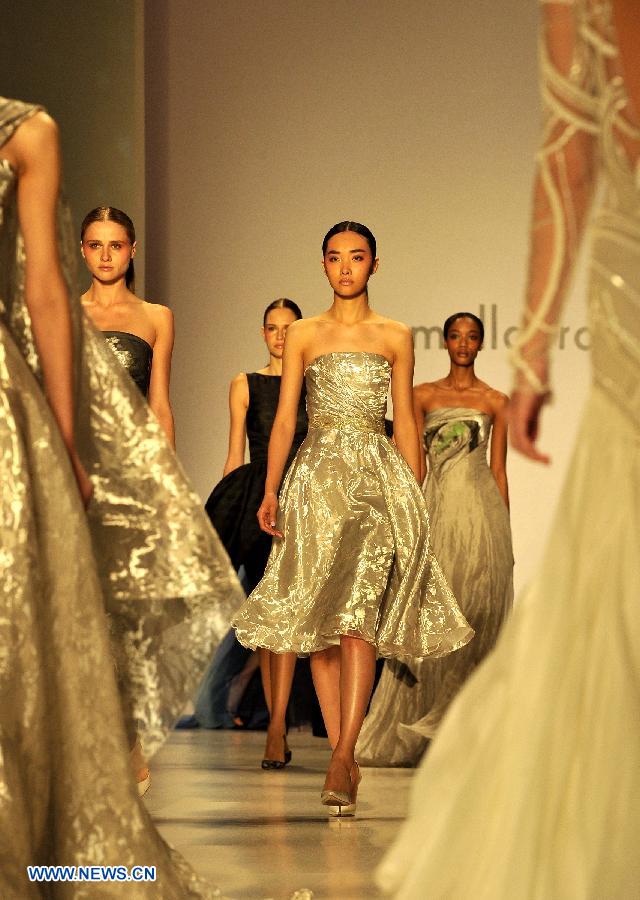 Models present creations of the Spring/Summer 2015 Pamella Roland collection during the New York Fashion Week in New York, the United States, on Sept. 9, 2014. (Xinhua/Wang Lei)
